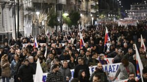 Hiriburuan, Atenasen, sindikatuek eta erakunde politikoek deitutako dozenaka mila pertsona Finantza Ministeriotik AEBetako enbaxadaraino joan ziren. The Left Chapter egunkariak Greziako Alderdi Komunistaren (KKE) informazioan oinarrituta jasotzen duenez, langileek mezu sendoa helarazi zuten Gobernuaren lehentasunen aurka: «Ez sakrifiziorik gerragatik, ezta haren onurengatik ere». Protestan, pankarta erraldoi bat zabaldu zuten Parlamentuaren aurrean, Grezia gerratik ateratzeko eta «heriotzaren oinarriak» ixteko eskatuz.