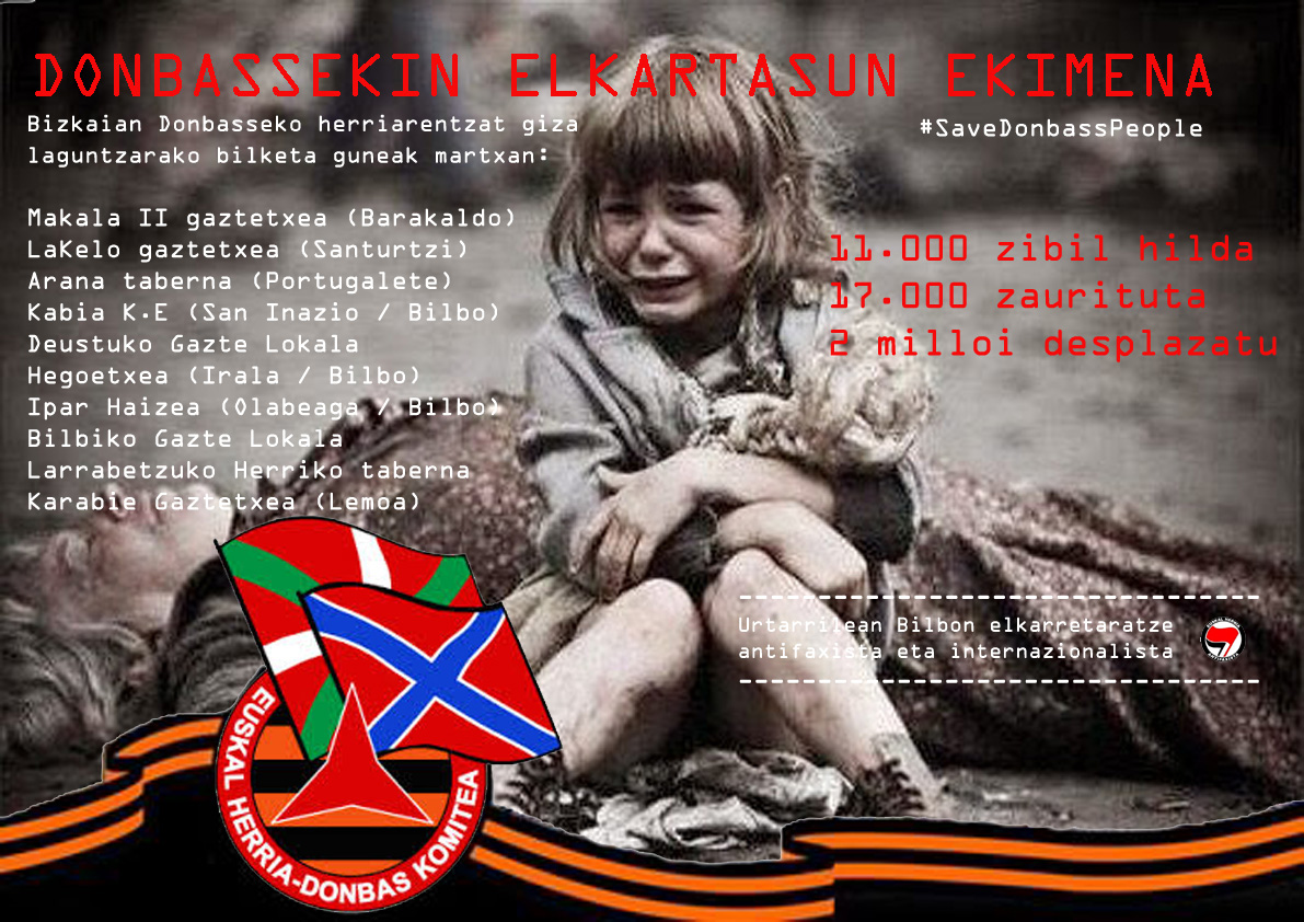 Europar eta estatubatuar inperialistek finantziaturiko, armatutako eta babestutako Ukrainako Junta nazi-faxista estatu-kolpearen bidez ezarri zenetik, Donbass eskualdeko Donetsk eta Lugansk Herri Errepubliken aurkako jazarpenak ez du etenik izan. Herri erresistenztia demokratiko eta antifaxista hau “errusiartzale”-tzat aurkezten digute han-hemenka herriak suntsitzen dituzten inperialisten jabego diren komunikabideek, bertan zer gertatzen ari denaren gaineko manipulazio eta desitxuraketa sortzeko eta munduko langileon arteko elkartasun internazionalista ekiditzeko. Euskal Herrian hainbat kontzientziazio kanpaina burutu egin da, gai honen inguruan informazioa emateko eta elkartasuna bultzatzeko.