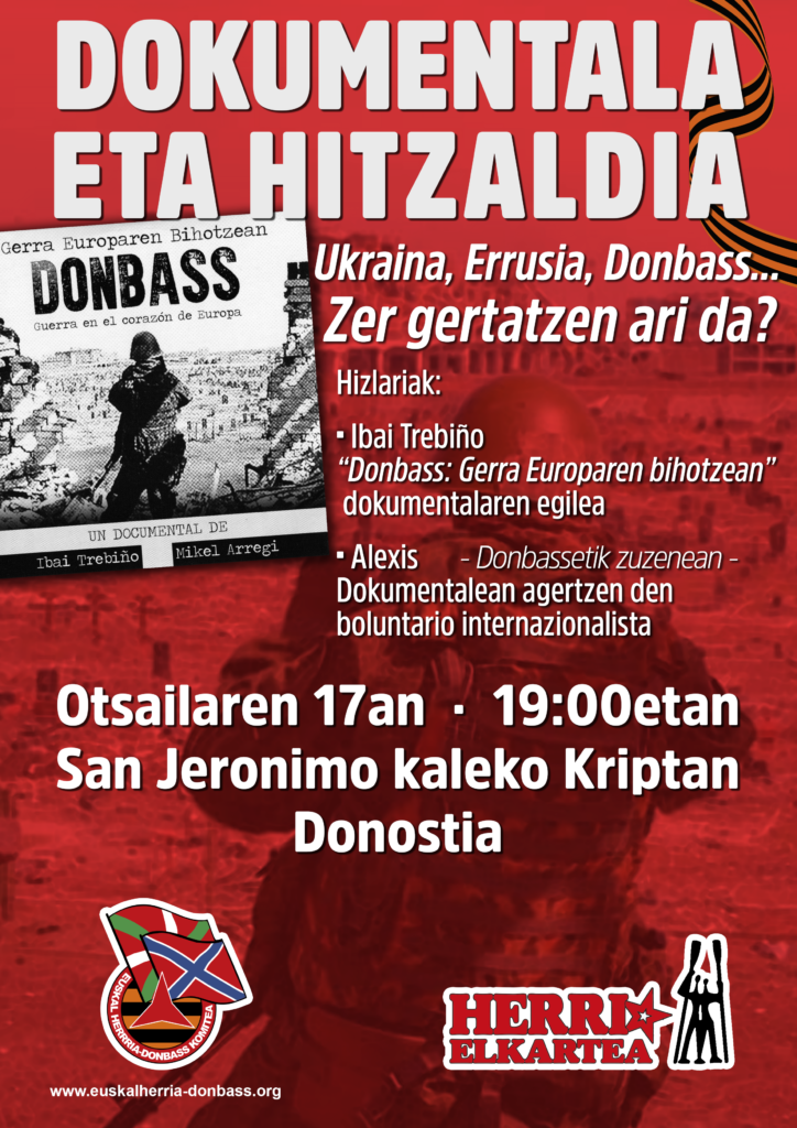 Datorren otsailak 17an Donostian Euskal Herria Donbass Elkartasun Komiteak eta Alde Zaharreko Herria Elkarteak hitzordua antolatu dugu Ibai Trebiñorekin, «DONBASS. Gerra Europaren Bihotzean» dokumentalaren egileetako bat. Ukrainia, Errusia eta Donbassen zer gertatzen ari den aztertuko dugu berarekin.