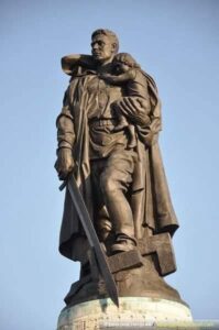 Sobietar Soldadu Askatzailearen Monumentua, erreskatatutako neska alemaniarrarekin. Bere eskuineko eskuak ezpata bat dauka eta esbastika bat du oinpean apurtuta.
