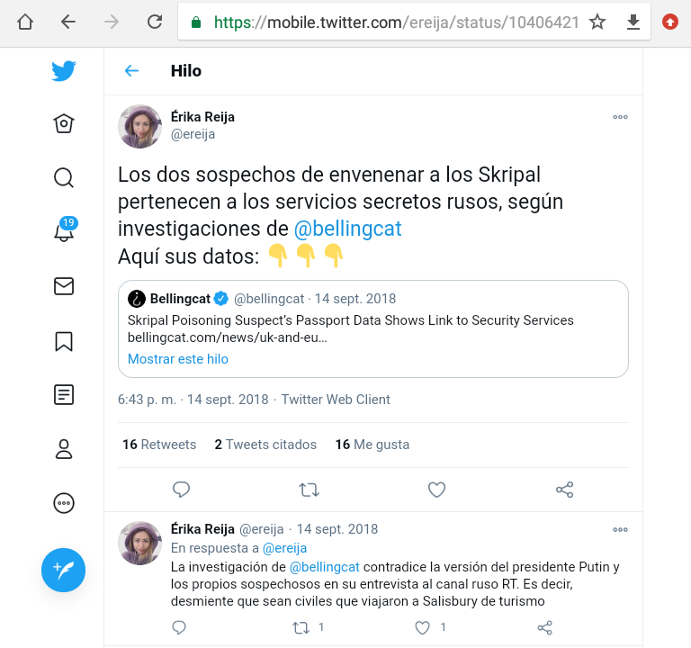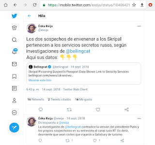 Otra de las corresponsales habituales es Érika Reija, que inyecta en cada aparición importantes dosis de carácter antiruso. Rusia es el gran enemigo a batir, además de China, por su poderosa influencia mundial y sus colosales riquezas, y a eso están. Recientemente nos mostraba, como un colectivo de «periodistas independientes», denominado Bellingcat, «probaba» la enésima acusación contra su presidente y sobre los maldecidos servicios secretos eslavos que parecía que querían perder el tiempo con una inexistente «oposición» política, que en realidad trabaja como mercenaria al servicio de intereses extranjeros y por eso es tan despreciada en Rusia, como ocurre con el tal Navalny.