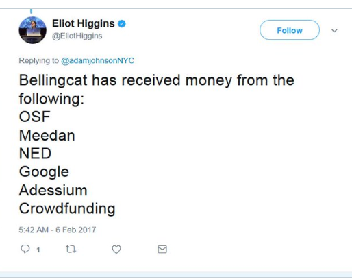 No hay que investigar demasiado para ver que tal colectivo es lo que es, un órgano de propaganda para demonizar a los rivales, y recibe el dinero de donde lo recibe. De hecho, nos lo dice la persona que pusieron como fundador de tal entramado, Eliot Higgins: la plata viene de la NED (National Endowment for Democracy) o de la misma o de la Open Society (OSF), de George Soros, un conocido delincuente financiero y político.
