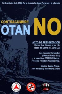 Por todo ello, el Frente Antiimperialista Internacionalista y la Asamblea OTAN NO de Madrid convocamos a un primer acto donde se expondrá y debatirá la trayectoria de esta organización criminal, la transcendencia de su próxima Cumbre, la renovación de las bases y un plan de acción para el futuro inmediato, que incluye la convocatoria de una Contracumbre Internacional para los días 24, 25 y 26 de junio en Madrid.
