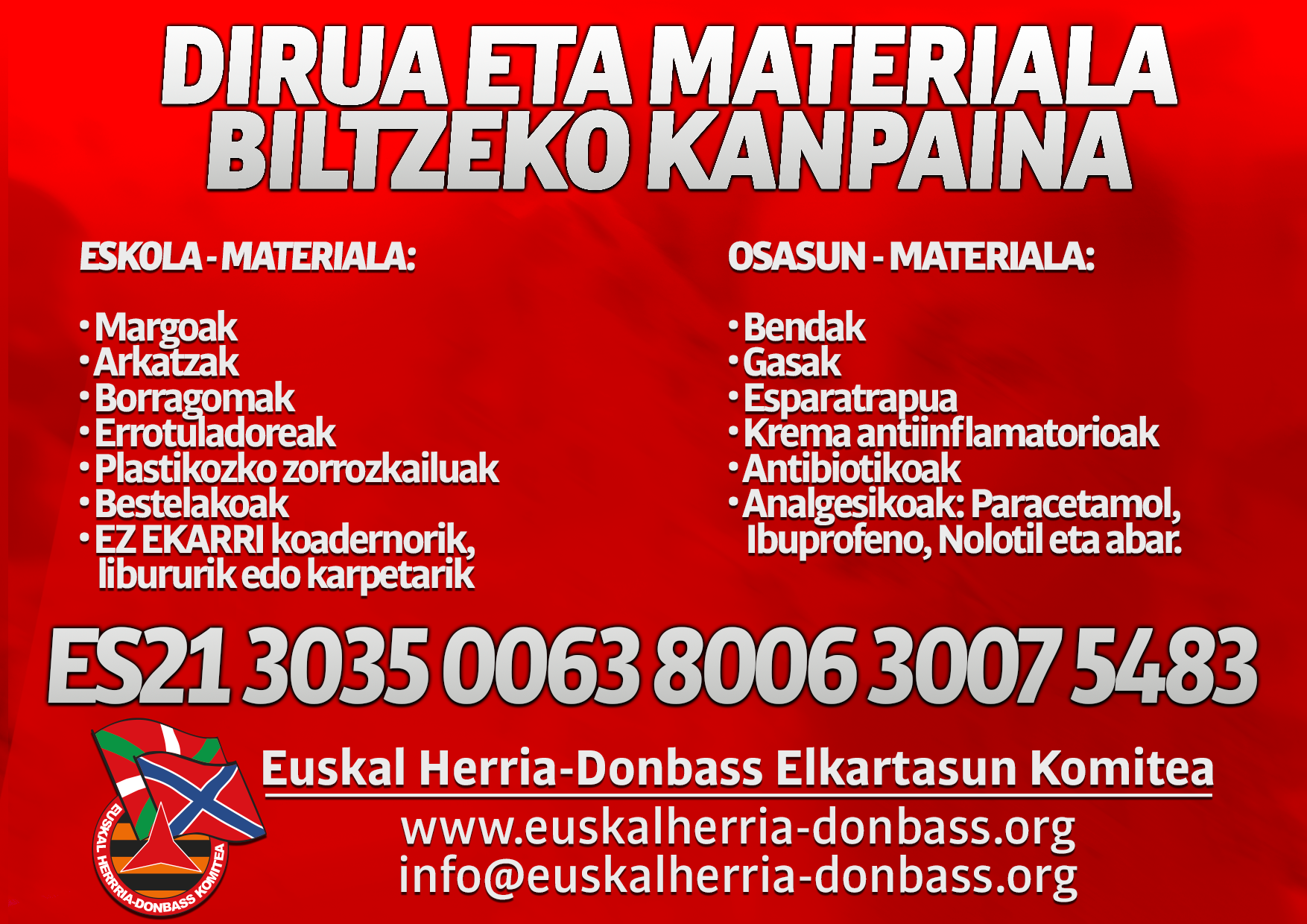 Euskal Herria-Donbass Elkartasun Komiteak, Karabana Antifaxistarekin batera abian jarri duen diru- eta material-bilketa kanpainaren berri du. Donbasseko gerra-eremuetan bizi diren haurrei eta umezurztegietan eta urritasunak dituzten haurrentzako zentroetan bizi diren umeei zein osasun-zentroetan dauden gaixoei laguntza humanitarioa emango die, aspalditik duten elkarlanari segida emanez. Bildutako diruarekin, eskola materiala eta material pedagogikoa erosteaz gain, ikasgelak egokitu, erietxeetan medikuntza-material berria erosi eta Ukrainako Armadaren bonbek suntsitu dituzten instalazioak berreraiki ahal izango dituzte.